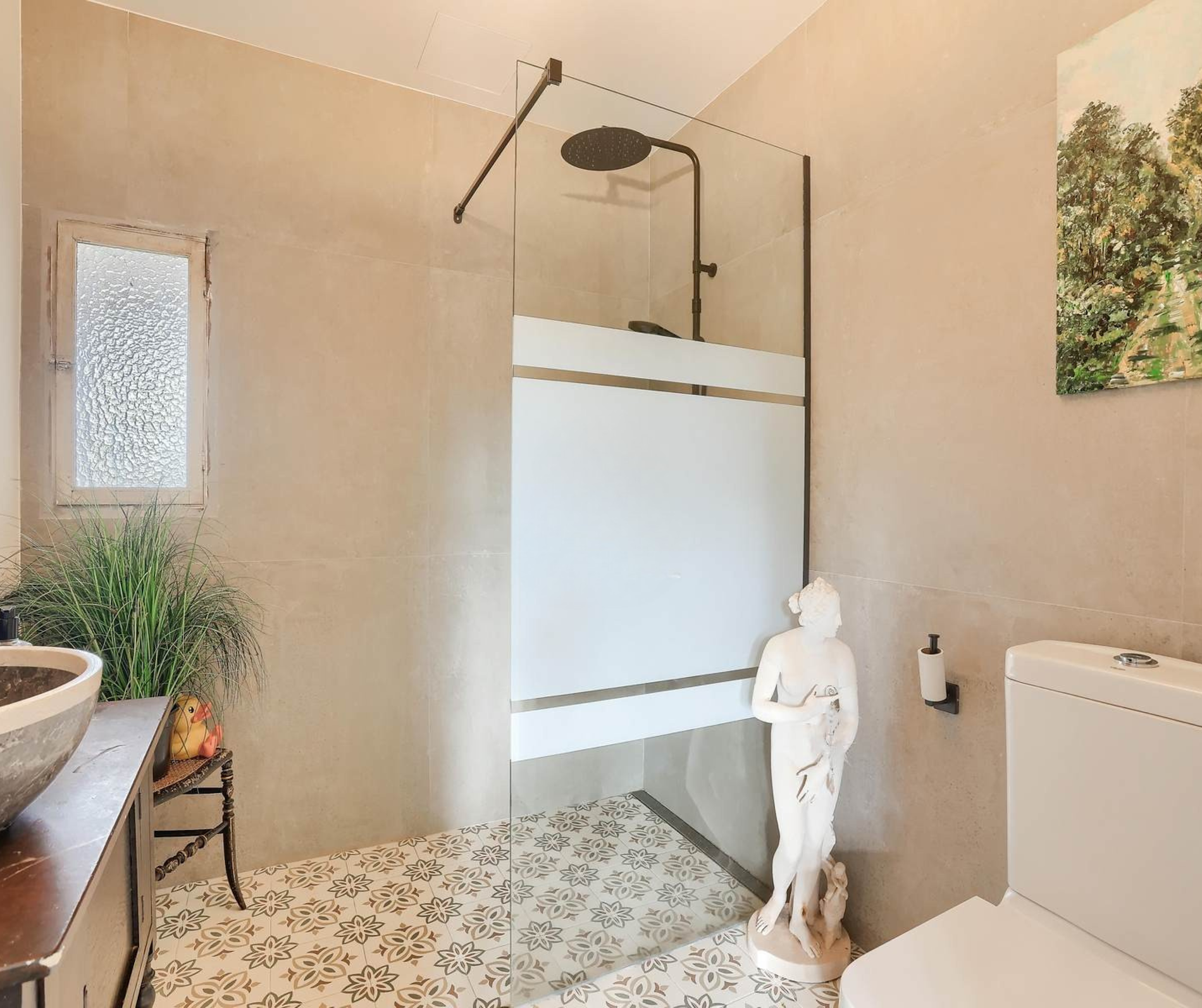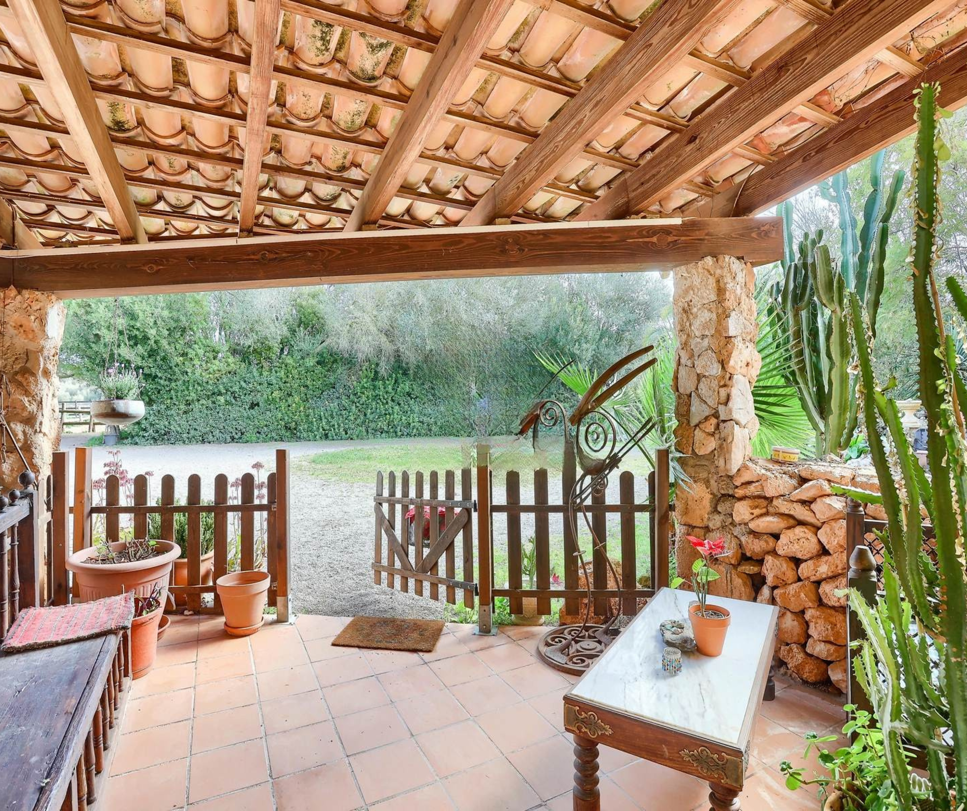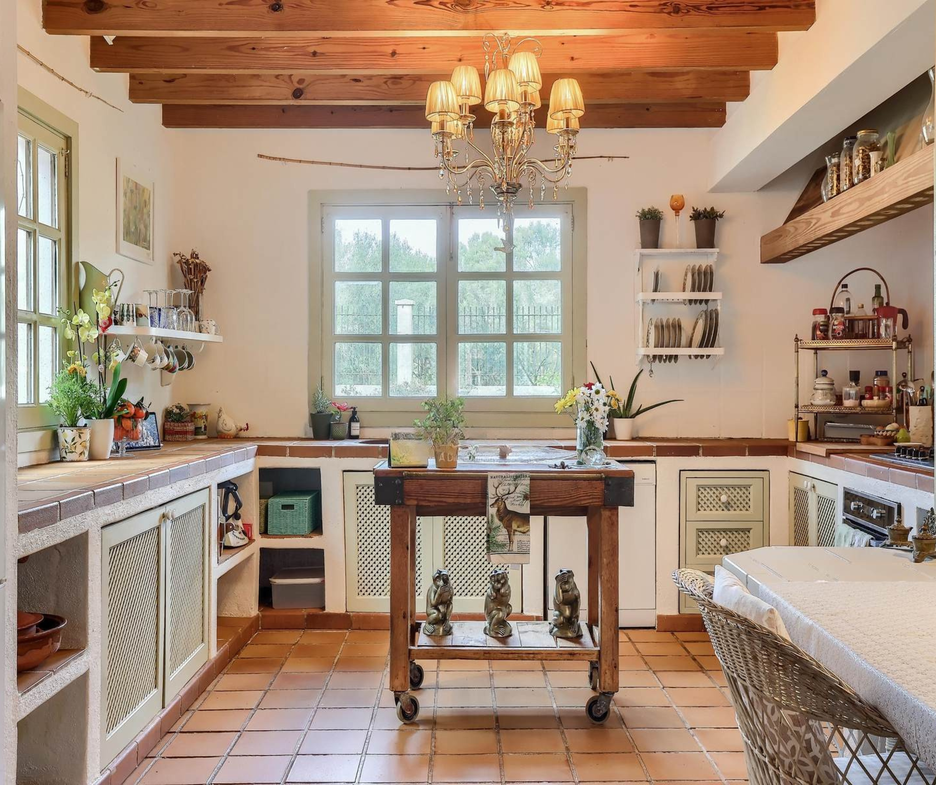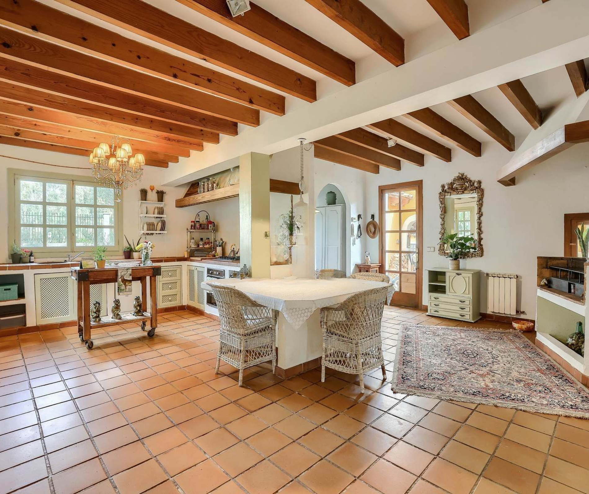 La casa principal, construida en el clásico estilo mallorquín, destaca por sus arcos, muros de piedra y varias chimeneas que aportan calidez y carácter. Sus amplios espacios abiertos se conectan de forma natural con terrazas y jardines, favoreciendo una vida interior–exterior sin fronteras. La finca dispone de cocina abierta totalmente equipada, varios salones, terrazas con vistas, aire acondicionado, calefacción, ventanas de doble acristalamiento y un diseño que invita al confort durante todo el año.